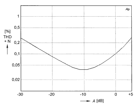 I když má oddělovací zesilovač relativně malé zkreslení a velmi dobrý odstup od šumu, praktické zkoušky a měření ukázaly, že potlačení rozdílového napětí (mezi zeměmi) se zhoršuje se vzrůstajícím kmitočtem. Zesilovač velmi dobře funguje při odstranění brumu, vznikajícího zemními smyčkami, v extrémních případech si však nedovede poradit s rušením od spínaných zdrojů. Někdy pomůže zkratovat země pro vf signály kondenzátorem C26, jindy spojit některou ze zemí s nulovým vodičem (kolíkem) v zásuvce. Kondenzátor C26 s spínač jsem dodatečně přidal mimo desku s plošnými spoji. Na úplný konec bych rád poděkoval panu Alanu Krausovi, který mi změřil zkreslení a kmitočtový rozsah zesilovače (obr. 4 až 6)