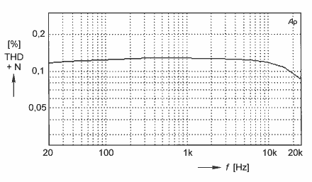 Obr. 5. Závislost zkreslení na kmitočtu při 0 dB (775 mV)