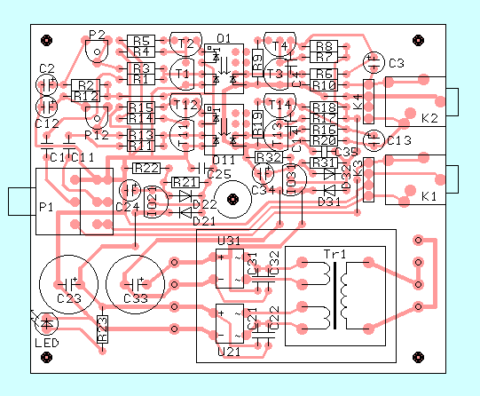 | P1 | 10 kOhm / N, potenciometr | D21, D22, D31, D32 | 1N4148, KA262 apod./or eq. | |