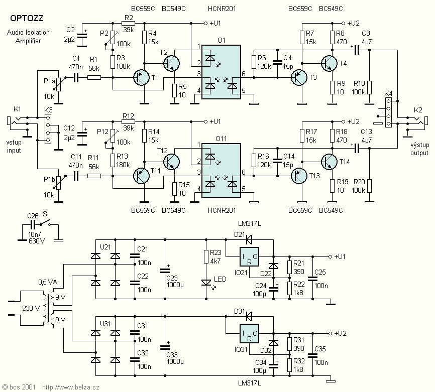 Galvanické oddělení signálů lze elegantně vyřešit oddělovacím transformátorem. Problematice oddělovacích transformátorů pro nf aplikace jsou např. věnovány internetové stránky http://www.jensen-transformers.com . Amatérsky schůdnější (a taky levnější) je použít ke galvanickému oddělení optočlen. Nejvhodnější jsou optočleny s jednou LED a dvěma fotodiodami, určené speciálně pro přenos analogových signálů. Zatímco jedna fotodioda je určena pro přenos galvanicky odděleného signálu, druhá, se stejnými vlastnostmi, je zapojena ve zpětné vazbě a neutralizuje nelinearitu obvodu. Použití fotodiod namísto fototranzistorů umožňuje nejen dosáhnout menšího zkreslení optočlenu, ale také rozšířit kmitočtový rozsah. Základem oddělovacího zesilovače je doporučené zapojení z obr. 16 katalogového listu optočlenu HCNR201 (lze stáhnout na http://www.semiconductor.agilent.com), které bylo pro daný účel doplněno o další součástky.