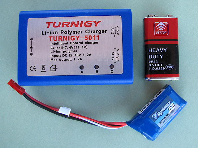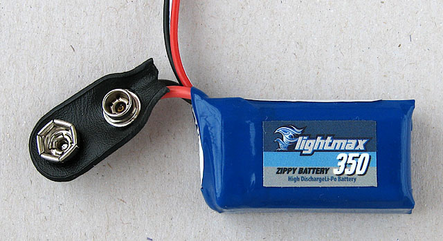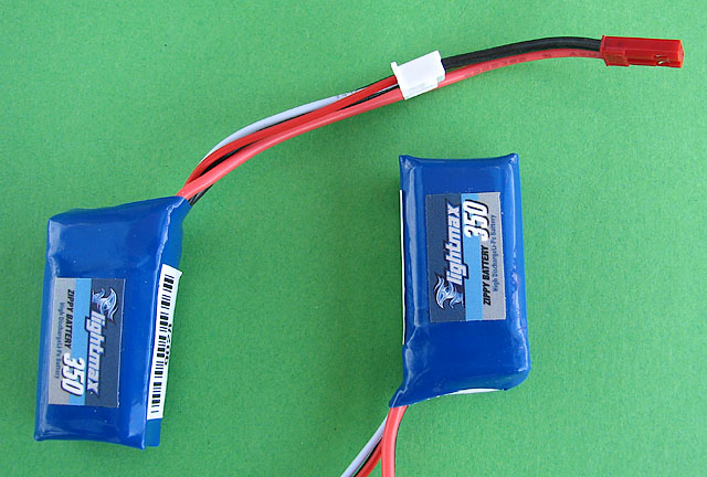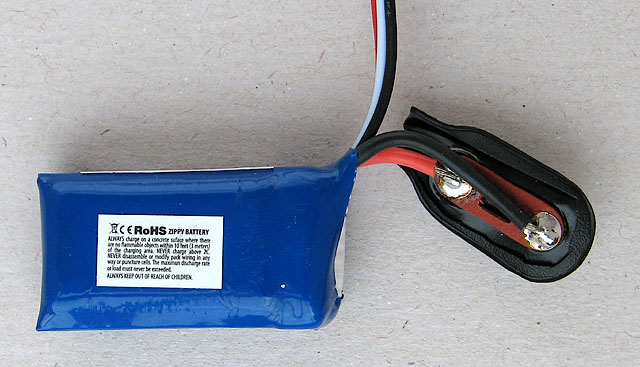 Použil jsem baterii Zippy Flightmax 350 mAh (http://www.hobbycity.com/hobbyking/store/uh_viewItem.asp?idProduct=9028&Product_Name=ZIPPY_Flightmax_350mAh_2S_20C__). Baterie má silový a servisní konektor. Silový konektor jsem nahradil klipsem. Servisní konektor je třeba ponechat, slouží k nabíjení! Koupit celou baterii je výhodnější ($3.79) než ji lepit z jednotlivých článků.