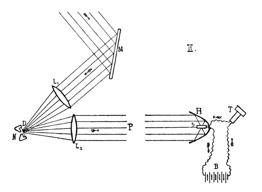 Diagram na obr. 1. znázorňuje nám fotofon. Zrcadlo M na stanici I. odráží paprsky světla slunečního nebo umělého ku skleněné čočce L1, kteráž je v ohnisku svém soustřeďuje na malém zrcadle D. Zrcadlo D upevněno jest na pružné bláně a odráží soustředěné naň paprsky ku čočce L2. Táž přemění rozbíhavé paprsky na rovnoběžné a vysílá je ku stanici vzdálené II. (ve směru DP podle šipky), kdež je zachycuje a ve svém ohnisku soustřeďuje parabolické zrcadlo H. V ohnisku tohoto zrcadla upevněn jest výše popsaný, válcový článek selénový S, od něhož drát jeden vede ku galvanické baterii B a druhý k telefonu T, jenž ovšem s batterií B též jest ve spojení. Proud galvanický jest takto uzavřen a vychází z baterie do telefonu, odtud do článku selénového a zpět do baterie. Toto procházení proudu v telefonu není slyšitelné, dokud proud ve své intensitě se nemění.