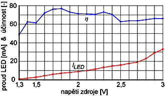 Měřit účinnost podobných měničů je vždy trochu problém. Napájecí napětí je impulsní nebo zvlněné. Zapojení měřidla do série s LED velmi zkreslí výsledky, protože na měřidle je úbytek napětí až několik set milivoltů. Účinnost jsem proto měřil nepřímo. LED jsem zasunul do krátké černé plastové trubky, proti LED jsem umístil fotodiodu (BPW43) zatíženou odporem 10 kiloohmů. U měniče jsem pro každé napájecí napětí změřil odběr a napětí na fotodiodě. V dalším „kole“ jsem nastavil na téže LED takové stejnosměrné napětí a proud, při kterém bylo na fotodiodě stejné napětí. Z příkonu měniče a příkonu LED (tj. výkonu měniče) jsem spočítal účinnost.