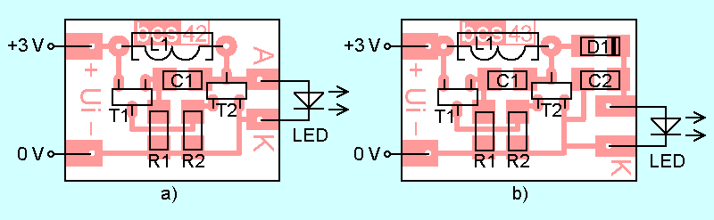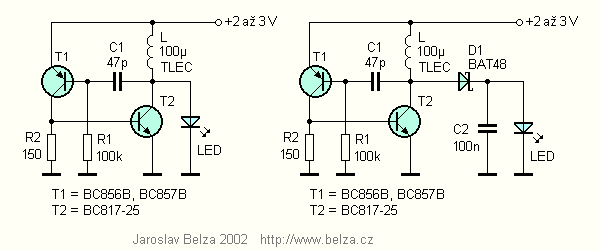 Navrhl jsem proto jednoduché zapojení ve dvou variantách, které je na obr. 1. V původním zapojení jsem nahradil jeden rezistor kondenzátorem a optimalizoval hodnoty součástek. Měnič nemá žádnou stabilizaci proudu, což však při napájení dvěma akumulátory NiCd nebo NiMH nevadí, protože jejich napětí se po většinu vybíjecí doby příliš nemění. Měnič je ve dvou variantách – s usměrňovačem a bez něj. Při experimentování s klasickými součástkami byla výhodnější varianta s usměrňovačem. Měnič měl větší účinnost. Při finální realizaci se součástkami SMD se však negativně projevil poměrně značný odpor malé Schottkyho diody (BAS85) a naopak účinnost měniče bez usměrňovače byla větší, patrně díky menším parazitním kapacitám.