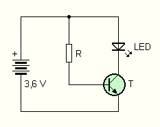 Zapojení omezovače proudu s tranzistorem (obr. 2) bylo již několikrát popsáno. Pro úplnost zopakuji, že proud procházející kolektorem tranzistoru určuje proud do báze a proudové zesílení tranzistoru. Potřebujeme-li např. proud LED 20 mA a tranzistor bude mít proudový zesilovací činitel 100, bude potřebný proud báze 20/100 = 0,2 mA. Na rezistoru bude napětí baterie zmenšené o úbytek na přechodu báze-emitor (asi 0,5 V). Odpor rezistoru vypočteme R = (3,6 - 0,5)/0,2 = 15,5 kOhm [kohm; V, mA]. Se změnou napájecího napětí se proud do báze mění, protože se mění napětí na rezistoru, avšak tato změna je menší, než změna proudu při použití pouhého sériového rezistoru.