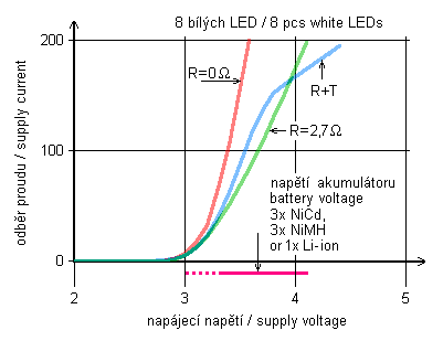 Na obr. 1 je proud tekoucí osmi bílými LED v závislosti na napájecím napětí. První křivka ukazuje proud LED v závislosti na napětí bez jakéhokoli omezení proudu. Je to vlastně voltampérová charakteristika LED. Z obrázku je zřejmé, že koleno charakteristiky není nijak ostré. Dioda opravdu začíná svítit už při napětí asi 2,8 V. V druhém případě je proud omezen rezistorem s odporem 2,7 ohmů a ve třetím tranzistorem s rezistorem do báze - viz obr. 2. Ve všech případech je při malém napájecím napětí svit LED prakticky shodný. U zapojení s tranzistorem je v rozsahu napájecích napětí 3,6 až 4,2 V změna proudu menší než 20 %, což je zcela dostačující. Ve skutečnosti se napětí akumulátoru při vybíjení mění velmi málo - po většinu času je napětí vybíjeného článku v rozmezí 1,2 až 1,3 V. Větší je jen pouze těsně po nabití a menší, až když je akumulátor téměř vybit.