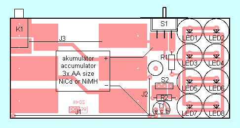 Většina součástek je na desce s plošnými spoji podle obr. 4 a 5. Mimo desku je pouze spínač S2, který umístíme podle potřeby nebo ho vypustíme a R2 nahradíme propojkou. Do desky vypilujeme výřez pro S1. LED jsou připájeny nadoraz k desce. Pájecí plošky je vhodné nejdříve pocínovat, abychom dobu pájení LED zkrátili na nezbytně nutné minimum. Místo R1 zapojíme provizorně odporový trimr s odporem 5 kOhm (pro 8 LED), nejlépe ještě v sérii s rezistorem 1 kOhm. Deska je navrhnuta tak, že zručnější kutilové na ni mohou přinýtovat kontakty pro běžné články. Pak se však na desku nevejde konektor pro nabíjení. Propojky J2 a J3 nezapojujeme! Spínač S1 je v krabičce proti palci levé ruky. Pokud by to nevyhovovalo, lze desku vyrobit a osadit zrcadlově převrácenou.