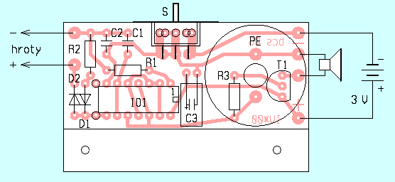Deska s plošnými spoji je na obr. 3 a 4, na obr. 5 pak ještě návrh desky s jiným rozmístěním součástek. Pod IO a diody použijte 20pinovou objímku. Ve 4 krajních kontaktech zleva budou diody, pak bude 1 pár volný a pak až do pravého kraje IO. Toto uspořádání umožní snadno a rychle vyměnit diody a IO, pokud náhodou "změříme" třeba elektrolytický kondenzátor nabitý na velké napětí. Deska je navžena tak, aby bylo možné použít k indikaci jak piezoelektrický měnič, tak malý reproduktor nebo sluchátko. Pro reproduktor osadíme R3 a T1, neosazujeme PE, viz zapojení na obr. 1.