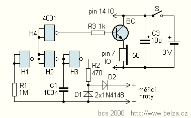 První verze přístroje je na obr. 1. Základem přístroje je oscilátor z hradel CMOS, jehož kmitočet je určen odporem zapojeným mezi měřicími hroty. Zatímco při jedné polaritě signálu se obvod uzavírá přes diodu D1, ve druhé přes D2 a vnější obvod. Odpor rezistoru R2 určuje zároveň nejvyšší tón při zkratovaných měřicích hrotech. Signál z oscilátoru je přiveden pře R3 na emitorový sledovač a sluchátko nebo malý reproduktor.