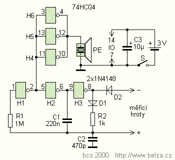 Na obr. 2. je novější verze zkoušečky. Obvod z řady 4000 jsem nahradil obvodem z řady 74HC a telefonní sluchátko piezoelektrickým měničem. Tím se zmenšil odběr proudu při zkratovaných hrotech a zlepšila funkce při téměř vybitých bateriích. Na základě praktických zkušeností s opravami monitorů a síťových spínaných zdrojů doporučuji umístit IO a diody do objímky. Asi 2x se mi podařilo "změřit" kondenzátor nabitý na 300 V, což pokaždé skončilo výměnou všech polovodičových prvků, jednou dokonce velmi efektním dýmem linoucím se z krabičky... V případě objímek opravíte zkoušečku za minutu a za cenu přibližně dvou pojistek. Z důvodu spolehlivosti byla také dioda D2 zapojena před rezistor R2. Zkoušečka pak na měřicích hrotech vydrží bez poškození malá napětí obou polarit.