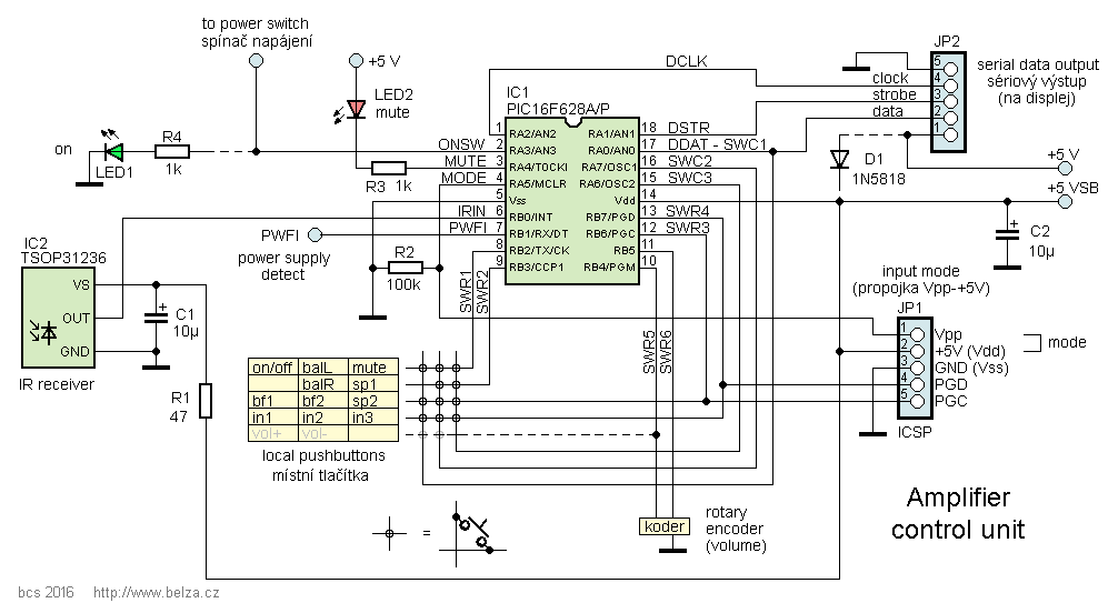 Zapojení řídicího obvodu zesilovače s dálkovým ovládáním je na obr. 3. Většina podstatných informací k funkci byla již zmíněna v minulé části. Za zmínku stojí ještě LED2 připojená na port RA4. LED se rozsvítí, je-li zvoleno MUTE nebo jsou odpojeny reproduktory. Port RA4 zůstává sepnutý na GND i při vypnutém zesilovači a LED může indikovat pohotovostní stav (Stand-By). Použití dvoubarevné LED k indikaci je na obr. 4.