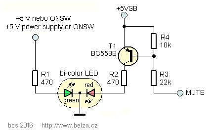 Obr. 4. Použití dvoubarevné LED k indikaci stavu zesilovače: