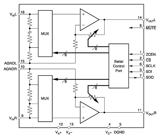 PGA2311 je stereofonní regulátor hlasitosti od Burr-Brown, který je dnes součástí firmy Texas Instruments. Je určený pro profesionální a high-end zesilovače, mixážní pulty a další audiozařízení. Zesílení lze nastavit v rozsahu od -95,5 do +31,5 dB v krocích po 0,5 dB. Srdcem obvodu je odporová síť, analogové spínače a kvalitní operační zesilovače. Analogovými spínači se řídí dělicí poměr vstupního děliče a zesílení operačních zesilovačů nezávisle pro každý kanál podle dat zapsaných do posuvného registru. Zkreslení signálu je typicky 0,0004 %, při zesílení 0 dB je výstupní šum 2,5 µV. Při napájení ±5 V může být rozkmit vstupního a výstupního napětí až ±3,75 V.