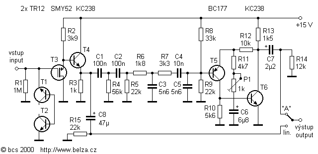 Následující zesilovač s tranzistory T5 a T6 kompenzuje útlum filtru. Trimrem nastavíme zesílení tak, aby na výstupu byl při kmitočtu 1 kHz v obou polohách přepínače stejně velký signál.