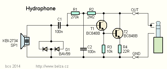 „piezoelement“, doplněný předzesilovačem s tranzistorem