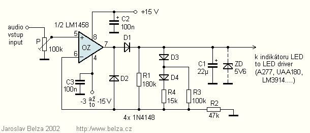 K indikaci úrovně audiosignálu se často používají sloupcové indikátory s LED. Použijete-li lineární sloupcový indikátor s lineárním usměrňovačem, bude dynamický rozsah nejvýše 20 dB. Použijete-li k usměrnění obyčejnou diodu, zmenší se dynamický rozsah na 12 až 14 dB, což je pro mnoho aplikací již zcela nedostatečné. V obou případech je navíc průběh indikace dosti nevýhodný - mezi rozsvícením první a druhé LED je rozdíl úrovně přes 10 dB, mezi posledními dvěma pak často pouze 1 dB. Dále popsaný usměrňovač slouží k rozšíření dynamického rozsahu těchto indikátorů.