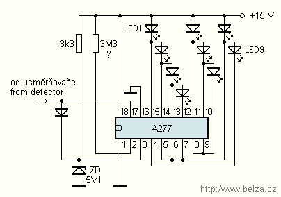 V následující tabulce jsou úrovně, při kterých se rozsvěcují LED. Použit byl budič A277 s referenčním napětím 5 V. V zapojení nebylo použito 12 LED (jak umožňuje obvod A277), ale jen 9. Výstupy na vývodech 5, 6, 7 a 8, 9 byly spojeny. Zapojení IO A277 je na obr. 2. Zenerova dioda, která je na obr. 1 se může v tomto případě vypustit, protože ji nahrazuje dioda a Zenerova dioda na obr. 2.