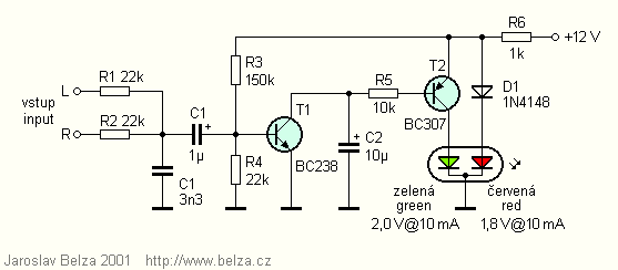 Zapojení indikátoru je na obr. 1. V nepřítomnosti signálu jsou tranzistory T1 a T2 uzavřeny a svítí červená LED. Přivedeme-li na bázi T1 nf signál, otvírají kladné půlvlny tranzistor T1. Tranzistor vybíjí kondenzátor C2, který se znovu nabíjí přes R5 a přechod báze-emitor T2. T2 se otevírá a zelená LED se rozsvítí. Pro správnou funkci obvodu je nutné, aby napětí na červené LED a sériově zapojené D1 bylo o několik desetin voltu větší než napětíí na zelené LED při stejném proudu. Podle potřeby lze D1 vypustit, případně doplnit další diodu do série s D1. Odporovým děličem R3, R4 je vytvořeno předpětí na bázi T1. Velikost tohoto předpětí ovlivňuje citlivost obvodu. Předpětí nastavíme změnou odporu R3. Při vynechaném R3 (žádné předpětí) je citlivost asi 800 mV, při R3 = 120 kOhmů asi 150 mV. Zmenšíte-li dále odpor R3, bude svítit zelená LED trvale. Odpor R5 a kapacita C2 určují časové konstanty obvodu.
