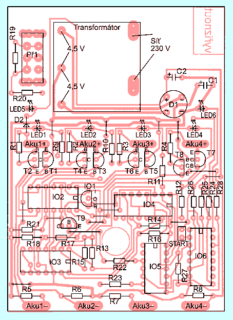 Deska s plošnými spoji (obr. 4) je navržena tak, aby ji bylo možné použít v původní krabičce. Do desky zapájíme původní pružinové kontakty, přepínač a upravený transformátor. Na vnitřní straně krabičky podle potřeby zkrátíme či úplně odstraníme výstupky, vymezující polohu desky. V místě výstupků jsou totiž na nové desce součástky. Dále vyvrtáme do čelního panelu čtyři díry o průměru 3 mm pro LED1 až 4, v ose článků u kladných kontaktů. Vrtáme z vnitřní strany, co nejblíže přepážce. Svítivé diody zapájíme do desky na plnou délku přívodů – jejich čelo je po zasunutí desky zároveň s rovinou čelního panelu. Tlačítko START je umístěno za zadní straně krabičky za přepínačem a s deskou propojeno krátkým kablíkem. Tlačítko je připájeno na malé destičce z kuprextitu. Tuto destičku připevníte ke krabičce šroubem s distanční podložkou. Přepínačem přepínáme typ nabíjených článků. V původní poloze „schnell” nabíjíme články s kapacitou 600 mAh, v poloze „normal” články 750 mAh. Tranzistory T2, T4, T6 a T8 je vhodné vybrat s přibližně shodným proudovým zesilovacím činitelem. Pak bude prakticky shodný i vybíjecí proud a nabíječku je možné použít k orientační kontrole kapacity článků.