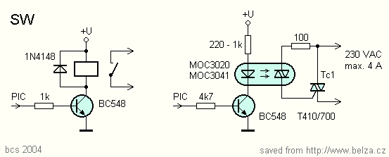 Dovolil jsem si přidat dvě zapojení spínačů, připojitelných k přijímači DO. Po vlastních zkušenostech s vf moduly Telecontrolli (prodává např. SEA- Praha), které jsou citlivé na zvlnění napájecího napětí, doporučuji napájet přijímač a PIC ze stabilizovaného zdroje (78L05, HT1050 apod.) a napájení spínače (+U na obr. 3 připojit před stabilizátor. Cívku relé volte podle napájecího napětí, rovněž odpor rezistoru v sérii s LED optotriaku zvolte podle napětí tak, aby LED tekl proud 10 až 20 mA u MOC3020 nabo MOC3041, resp 5 až 10 mA u MOC3043.