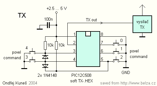 Na obr. 1 vysílač, na obr. 2 přijímač dálkového ovládání s mikrokontroléry PIC12C508. Souprava umožňuje přenos pěti povelů. Mikrokontroléry realizují kodér a dekodér povelu, pro vlatní přenos jsou použity vf moduly pro bezlicenční pásmo 433 nebo 866 MHz. Použil jsem moduly Aurel, lze použít i jiné vf moduly nebo i infra. Vysílač a příjímač mají vlastní originální kód, takže fungují jen spolu. Dálkové ovládání se hodí např. jako bezdrátový zvonek nebo pro bezdrátové zapínání světla. Program pro mikrokontroléry je zde. Při programování připojte interní oscilátor a vývod resetu trvale k Vcc. Zvolte nějaké id, shodné jak na vysílač i přijímači. Toť při programování vše.