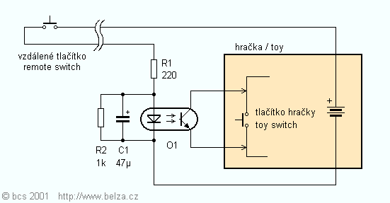 Obvod s optronem je vhodné umístit co nejblíže k hračce, nejlépe přímo do ní. Spoje od optronu k původnímu tlačítku by měly být co nejkratší. Optron může být téměř jakýkoli, já jsem použil typ 4N35. Měřidlem zjistíme polaritu napětí na tlačítku hračky. Není to však nutné, zapojení bude fungovat většinou i s inverzně zapojeným fototranzistorem, protože spínaný proud je velmi malý. K napájení je použita baterie v hračce. Pokud je hračka napájena miniaturními knoflíkovými články, je lepší použít k napájení dvě "tužkové" baterie (velikost AA nebo AAA) v pouzdru mimo hračku.
