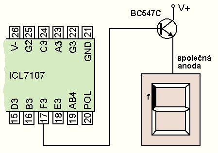 Uvědomil jsem si však následující skutečnost: protože voltmetr bude zobrazovat napětí do 30 V, tak na třetí segmentovce (nejvyšší řád) se budou zobrazovat pouze číslice 0, 1, 2 a 3. A z těchto cifer právě jedině 0 vyžaduje rozsvícení segmentu f na segmentovce. Připojil jsem tedy vývod pro tento segment na bázi libovolného tranzistoru NPN, který spíná přívod napětí pro třetí segmentovku. Ostatní vývody jsou zapojeny normálně. Nyní, pokud se má zobrazit nula, objeví se nulové napětí na bázi tranzistoru a ten vypne přívod napětí. Nulu tedy segmentovka neukáže.