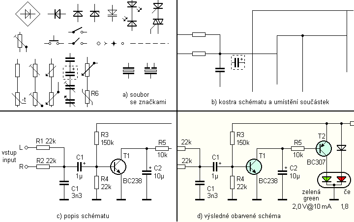 Uvedu zde ještě jeden, jednodušší postup. Schémata lze nakreslit v nějakém simulačním programu pro elektroniku. Vyzkoušel jsem Electronics Workbench (verze 3.0) a SIMetrix Intro (verze 3.1 a 4.0). Druhý se mi zdá pro daný účel vhodnější, neboť umožňuje větší volnost při kreslení spojů a číslování součástek. Schéma pak uložíme jako kopii obrazovky a následně upravíme nějakým grafickým editorem. Výhodou tohoto postupu je, že obrázek má to správné rozlišení pro publikování na webu a navíc si ho můžeme vytisknout v lepší kvalitě. Současně lze obvod rovnou nasimulovat a vyzkoušet. Nevýhodou je absence některých schématických značek, jiné mají grafickou úpravu odlišnou od běžných zvyklostí.