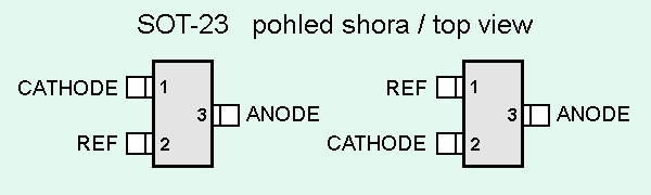 | TL431 (TI, Diodes, ST) TL431 (NXP) (Note 1) TL431N-xx (UTC) KIA431B (KEC) TLV431 (TI) LT431W (LITEON) 1) všechny typy nekončící MFDT a MSDT All types without MFDT and MSDT ending |