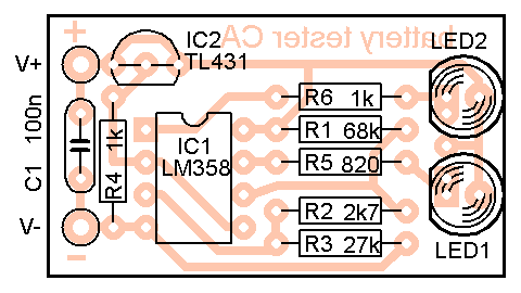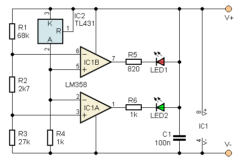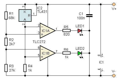 Vzhledem k malému napájecímu napětí nelze použít jakýkoli operační zesilovač, většina těch „historických“ při malém napájecím napětí nepracuje. Zapojení je navrženo pro běžný dvojitý OZ typu LM358 (LM258, LM2904 – mají stejné vnitřní zapojení), případně lze použít dva OZ z pouzdra LM324. Tyto OZ umějí pracovat s napětím blízko záporného napájecího napětí (mají na vstupu PNP tranzistory), ale největší napětí, kdy je IO ještě v lineární oblasti, je pro vstup i výstup asi o 1,5 V menší než kladné napájecí napětí. Proto je napěťová reference připojena ke kladnému pólu napájení a LED jsou spínány k zemi.