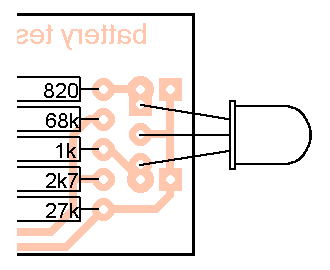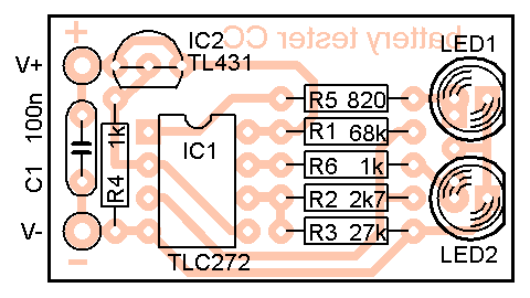 Deska s plošnými spoji (obr. 2) je navržena pro klasické součástky. Lze osadit buď samostatné LED, nebo dvoubarevnou LED se společnou anodou (obr. 3). Pak je vhodné zvolit odpory R5 a R6 tak, aby v intervalu, kdy svítí obě LED, svítily oba čipy přibližně stejně a výsledkem byla žlutá nebo oranžová barva.