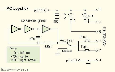 Elektrické zapojení joystiku k počítači je velmi jednoduché - viz obr. 1. Zapojení jsem obkreslil z joystiku, který jsem opravoval. Místo obvodu 74HC04 by asi šel použít i obvod 4049 (pozor, má napájení na vývodech 1 - Vdd a 8 - Vss). Určitě by bylo možné použít jakýkoli multivibrátor, třeba s 555 nebo dvěma tranzistory. Horší to už bude s mechanickým provedením. Jednoduchý knipl by snad bylo možno vyrobit takto: Osy potenciometrů zkrátíme na asi 8 mm a zbrousíme tak, aby v průřezu měly tvar půlkruhu. Za takto zroušené osy potenciometry k sobě připevníme. Jeden potenciometr pak připevníme k tělu joystiku, na druhý připevníme ovládací páku - kroutíme tedy tělem potenciometru. Pákou je pak možné hýbat v obou směrech. Protože u potenciometru využíváme jen část odporové dráhy, zvolíme typ s odporem 500 kOhm. Budu-li mít chvíli času, zkusím to vyrobit.