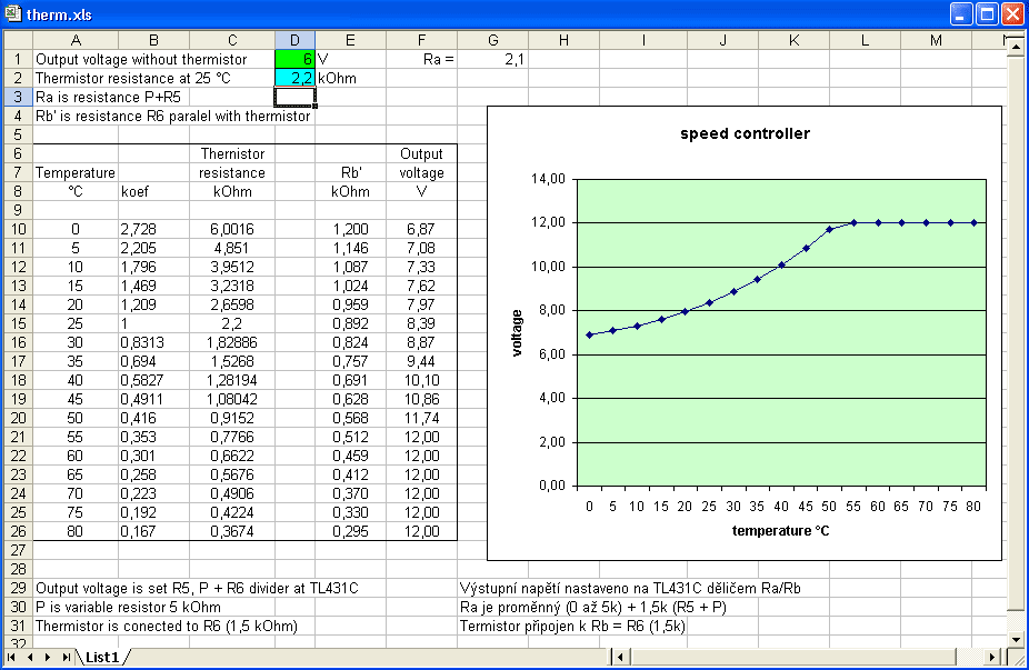 thermistor resistance. Set output voltage from 5 to 12 V to green
