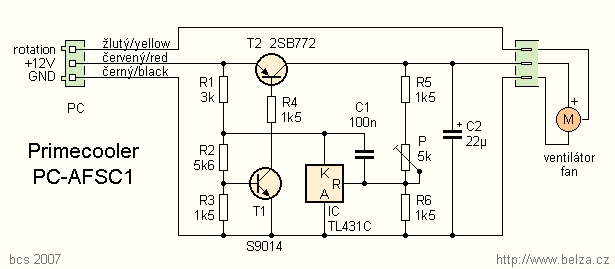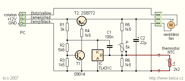Kamarád mě požádal, abych zkusil, zda levný regulátor otáček nepůjde upravit tak, aby se otáčky ventilátoru v PC zvětšovaly s teplotou. Jednoduchá úprava regulátoru je zde popsána. Regulátor ventilátoru není nic jiného, než regulovatelný zdroj napětí 5 až 12 V. Připojením termistoru se výstupní napětí mění s teplotou. Odpojí-li se termistor, zůstane zachována původní funkce regulátoru. Popsaná úprava není zcela optimální, ale je nejjednodušší.