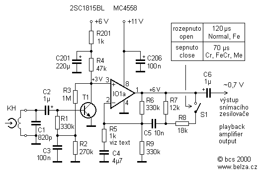 Korekční článek je zapojen ve zpětné vazbě IO1. Kondenzátor C5 a rezistor R7 tvoří korekční člen s časovou konstantou t1 = 120 µs pro pásky typu Fe, paralelním připojením R8 se časová konstanta zmenší na 72 µs (podle normy 70 µs) pro pásky Cr a Me. Časová kostanta t2 je určena R6 a C5 na asi 3300 µs (norma 3159 µs). Avšak protože je kmitočtová charakteristika snímacího zesilovače při nízkých kmitočtech stejně zvlněná (vlivem opásání snímací hlavy páskem), stačí ji dodržet jen přibližně. K přepínání typu pásku jsem použil obyčejný dvojitý spínač. Jakýkoli elektronický přepínač by zapojení zkomplikoval.