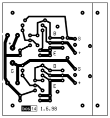 Deska omezovače zkratového proudu je na obr. 2, rozmístění součástek na obr. 3. Na desku lze osadit dva omezovače proudu. Jeden používám pro napájení kazetového přehrávače, druhý pro externí FM tuner. Použijete-li pro výstup napětí konektor SCD-016 (značení GM) ořízněte desku na menší rozměr naznačený čarou, pro jiný typ konektoru (přišroubovaného k úhelníku) ponechte desku větší. Tranzistor T1 lze osadit v pouzdře TO220 nebo TO125 apod. (T1´). Chladič V7131 je přišroubován samořeznými (nebo M3) šrouby. Na obr. 4 je úhelník pro přichycení omezovače k záslepce nebo k zadní stěně PC do otvoru pro konektor CANNON25.