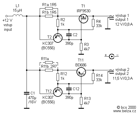 Místo tranzistoru HEXFET s kanálem P můžete beze změny ostatních součástek použít na místě T1 mnohem levnější dvojici tranzistorů v Darlingtonově zapojení, např. BD676. Pak je však třeba počítat s úbytkem napětí asi 0,7 V i na zcela otevřeném tranzistoru. Tuto variantu jsem použil u druhého výstupu napětí.