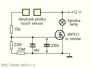 Žárovku i s větším výkonem lze spínat jednoduchým obvodem podle obr. 1. Lze jej použít v reklamních poutačích nebo i na jiných místech, kde by mechanické tlačítko mohlo být zničeno. Zenerova dioda chrání hradlo tranzistoru před zničením. Dioda nesmí mít velký svod. Doplníme-li zapojení o kondenzátor, svítí žárovka ještě chvíli poté, přestaneme-li se dotýkat plošek senzoru. S kapacitou kondenzátoru 330 nF svítí žárovka ještě 10 až 20 sekund a pak během 1 až 2 sekund zhasne. V zapojení můžeme použít libovolný tranzistor HEXFET. Pro proudy do 1 A můžeme použít např. IRFD110, pro proudy do 9 A např IRF520. Pro ještě větší proudy lze použít BUZ11 nebo lRF540. Protože prahové napětí použitých tranzistorů je asi 4 až 5 V, musí být napájecí napětí nejméně 9 V. Žárovku volíme podle napájecího napětí.