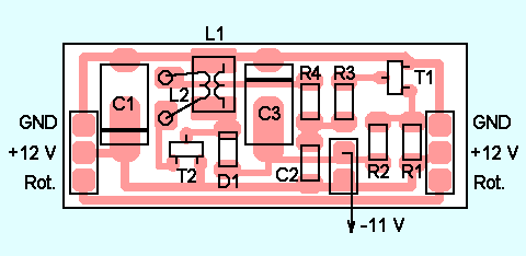 Základem měniče z obr. 1 je blokující samokmitající měnič s tranzistorem T2. Dokud je tranzistor T2 otevřený, zvětšuje se proud cívkou a cívka se „nabíjí“. Záporné napětí vzniká překmitem napětí na cívce L1 po uzavření T2. Dioda D1 napětí usměrní a kondenzátor C3 vyfiltruje. Báze tranzistoru T2 je buzena z vinutí L2. Pro správnou funkci je třeba dodržet smysl vinutí. Nebude-li měnič kmitat na první zapojení, zkuste prohodit konce vinutí L2. V zapojení byla použita cívka 56 µH (SMD4), na kterou jsem přivinul tenkým drátem 4 závity L2. Indukčnost cívky není kritická. Pro větší výkony bude vhodnější hrníčkové jádro s poměrem závitů mezi vinutími asi 10:1.