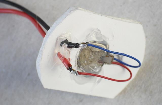 Já jsem použil obě poslední varianty. Na obr. 4 je 12V bzučák spolu se zvyšujícím měničem MT3608 z čínského e-shopu Aliexpress. Přímo k desce měniče jsem připájel svorkovnici a bzučák. Tuto sestavu jsem pak vložil do dózy od Ibuprofenu, která zajistí odolnost vůči vlhkosti. Do víčka dózy jsem zašrouboval nejmenší běžně prodávanou těsnicí kabelovou průchodku (PG-7) – obr. 5. Je důležité vypodložit bzučák tak, aby byl přitisknut ke stěně dózy, jinak se jeho vibrace do půdy špatně přenášejí. Odběr bzučáku s měničem je při napájecím napětí 4 V asi 70 mA.