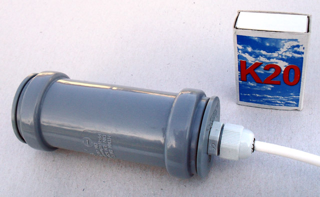 Ve druhém bzučáku jsem použil vibrační motorek ze starého mobilního telefonu. Motorek jsem vlepil do plastové příčky (obr. 6) a tu pak umístil do spojky od plastového odpadového systému HT o průměru 32 mm. Konce spojky jsou uzavřeny víčky ze stejného systému. Gumové těsnicí kroužky ve spojce umožnují zachovat dobrou rozebíratelnost při výborné těsnosti pouzdra. Přívodní kabel prochází těsnicí průchodkou. Víčko, kterým průchodka prochází, však není zcela hladké a průchodka na nerovném povrchu špatně těsní. Doporučuji proto nápisy na víčku trochu zbrousit a pod průchodku dát těsnění, nebo těsně před montáží průchodku podmáznout silikonovým tmelem. Celá sestava vibrátoru je na obr. 7. Odběr při 4 V je asi 50 mA.