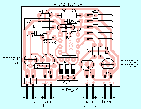 Programovací napětí Vpp mikrokontroléru PIC12F1501 je jen 8 až 9 V, na rozdíl od starších typů, které mají programovací napětí 13 V. Proto byl do zapojení doplněn rezistor R6 a Zenerova dioda D2. Pokud máte programátor, který již nižší programovací napětí podporuje, můžete R6 nahradit zkratem a D2 vypustit.