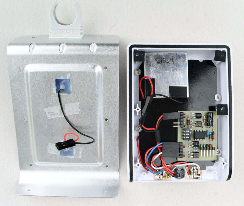 Deska s plošnými spoji a osazení desky je na obrázcích 9 a 10. Na výšku není pro součástky moc místa, proto jsou vyšší součástky naležato a mikrokontrolér je bez objímky. Protože se jedná o venkovní zařízení, mělo by být pokud možno odolné nepřízni počasí. Řídicí obvod jsem umístil do krabičky od solární lampičky z výprodeje v GM electronic. Z původní lampičky je použit solární článek (je součástí pouzdra) a Li-ion akumulátor. Desku s původní elektronikou jsem odstranil. Desku s LED jsem v pouzdru ponechal, LED však nejsou nikam připojeny. Máte-li pro LED jiné využití, lze desku nahradit jinou, kterou si vyrobíme. Na desce s LED je oboustranně lepivou páskou přichycen akumulátor a deska s elektronikou. Dodatečně jsem do plašiče přidal spínač akumulátoru, abych, jako loni, nemusel plašič rozebírat, když jsem ho chtěl na zimu uložit. Tlačítkový spínač s aretací jsem tavným lepidlem přichytil v místě, kde byl původně mikrofon. Jako výstupní konektory jsem použil modelářské konektory XT60, které jsem vlepil do pouzdra krabičky. Prostor kontaktů je před stékající vodou chráněn krytem konektoru. Pro daný účel jsou tyto konektory zbytečně robustní a v případě možnosti lze použít jakékoli jiné. Uspořádání vnitřku krabičky je na obr. 11.