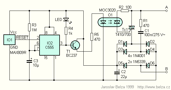 Schéma časového spínače je na obr. 2. Vyřešit napájení obvodu bylo nejtvrdším oříškem celé konstrukce. Časový spínač musí být napájen jak při sepnutém, tak i rozepnutém triaku. Není-li přítomno žádné napájecí napětí, např. jsou-li vývody A a B zkratovány tlačítkem, je po obnovení napájení spuštěn časovací obvod. Je-li triak sepnut, prochází proud přes žárovku (viz obr. 1) do přívodu A a přes triak na můstkový usměrňovač s diodami D1, D2, D5 a D6. Na místě D5 a D6 jsou použity Zenerovy diody s napětím 5,6 V. Zenerovy diody se střídají ve stabilizaci podle momentální polarity napájecího napětí. Celkový úbytek napětí mezi vývody A a B je asi 7 až 8 V, což se na jasu žárovky prakticky neprojeví. V klidovém stavu je obvod je napájen jalovým proudem, procházejícím rezistorem R1 a kondenzátorem C1. K usměrnění jsou nyní použity diody D3 až D6. Výstupní napětí je stabilizováno Zenerovými diodami, stejně jako v předchozím případě. Filtrační kondenzátor C2 má záměrně velmi malou kapacitu, aby časový spínač reagoval i na krátké stisknutí tlačítka.
